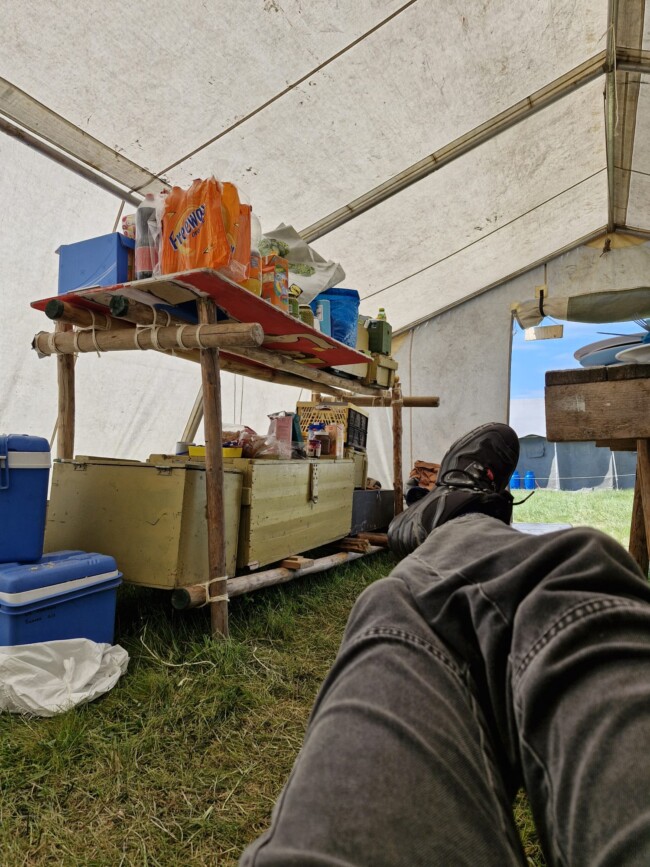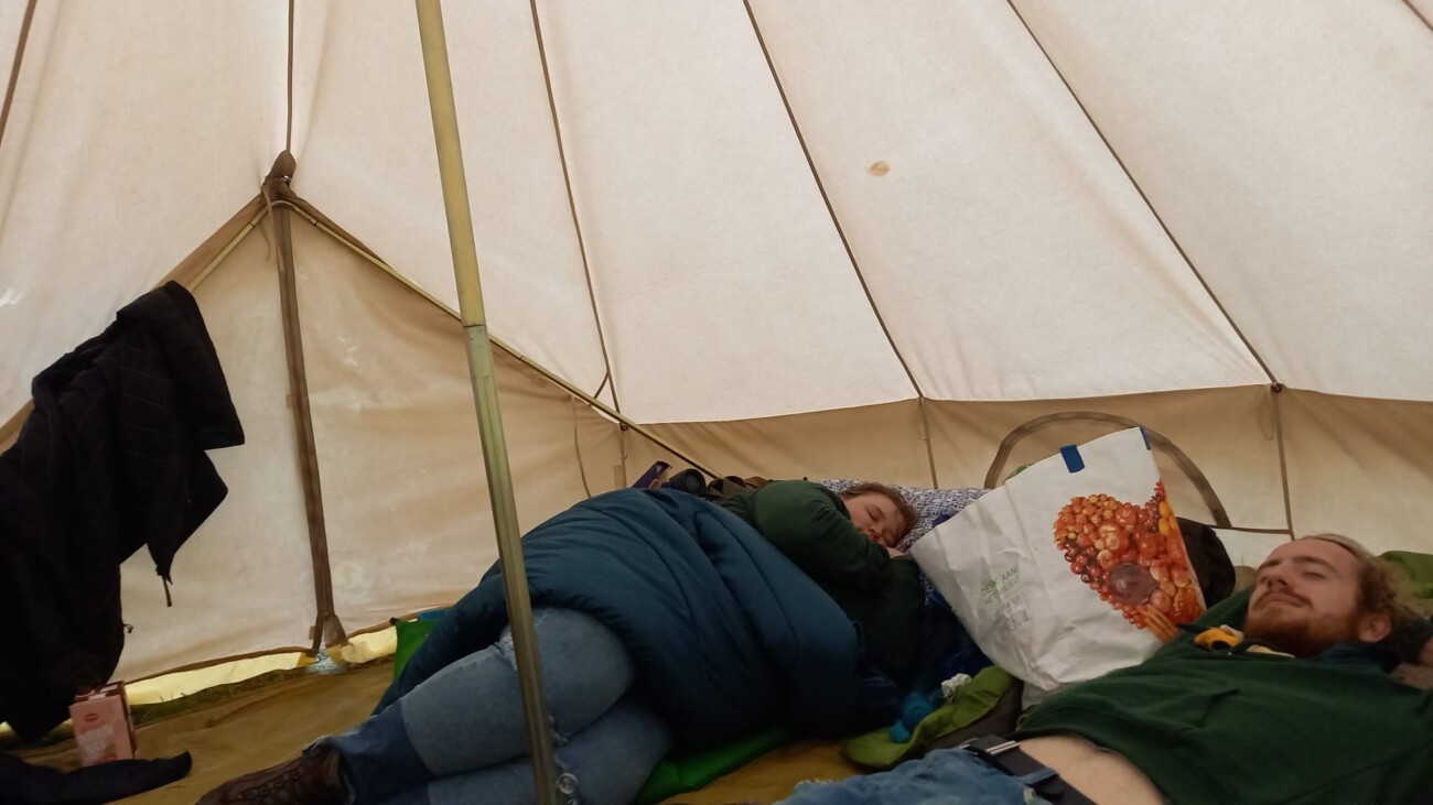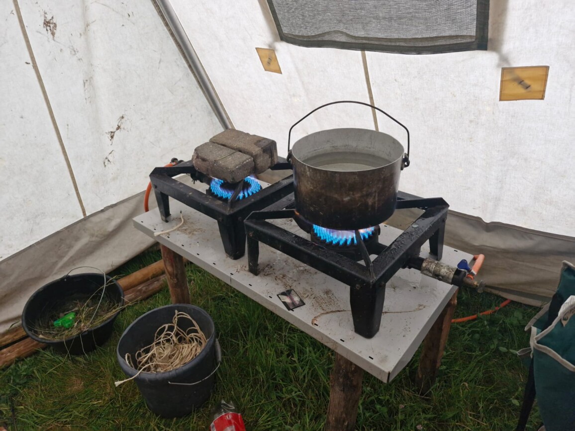 De scouts hebben onderdak geboden voor de kinderen en de ouders. We hebben geen verwarming, dus om de tent op temperatuur te krijgen koken we water (tot het bijna drooggekookt is, daarna vullen we het weer bij) en leggen we stevige bakstenen op het rooster. Deze worden vervolgens heetgestookt.