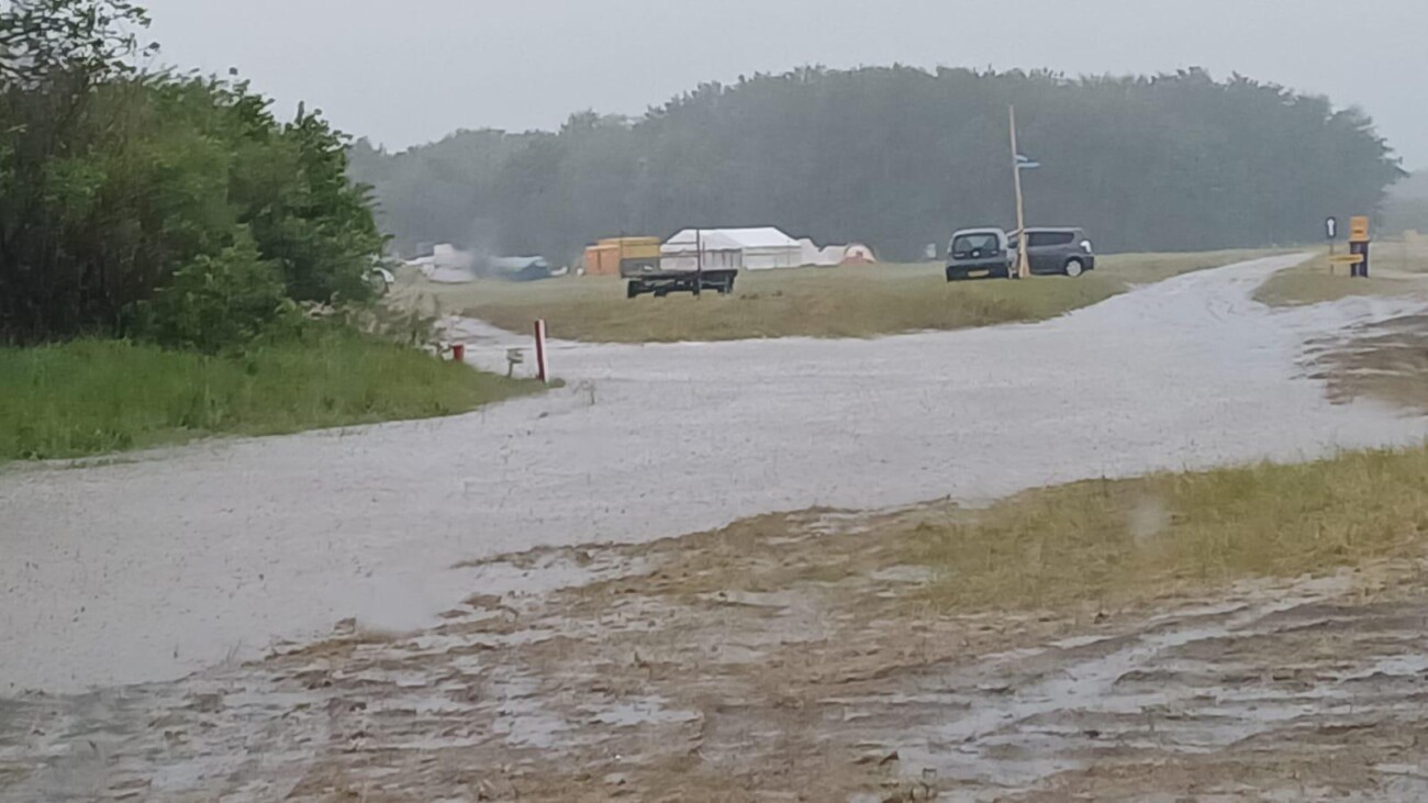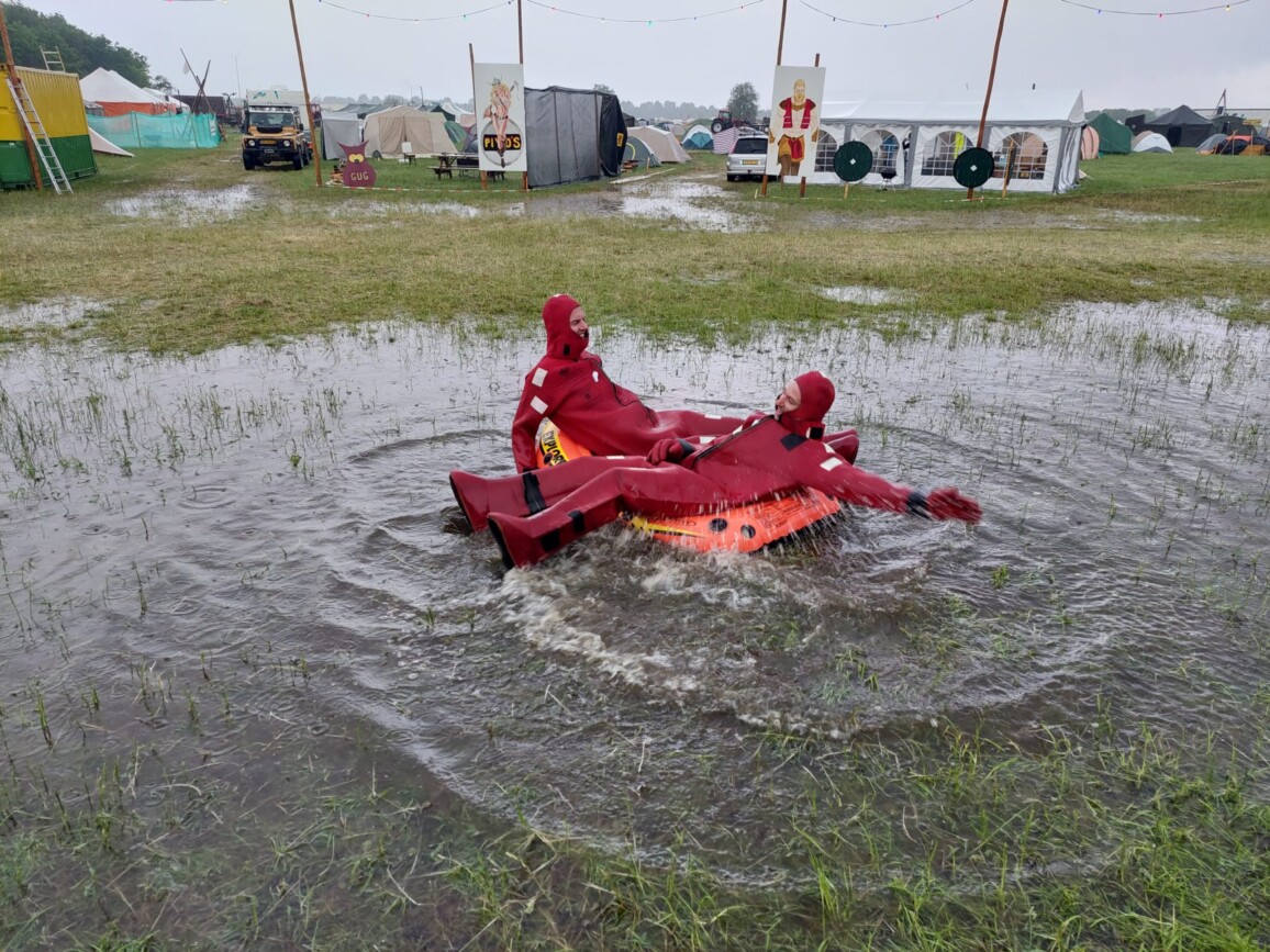 Vanaf 18:00u werd het menens. Het water kan niet weg, de wegen worden onbegaanbaar. Sommige leiding (van een andere groep) houden het plezier erin!