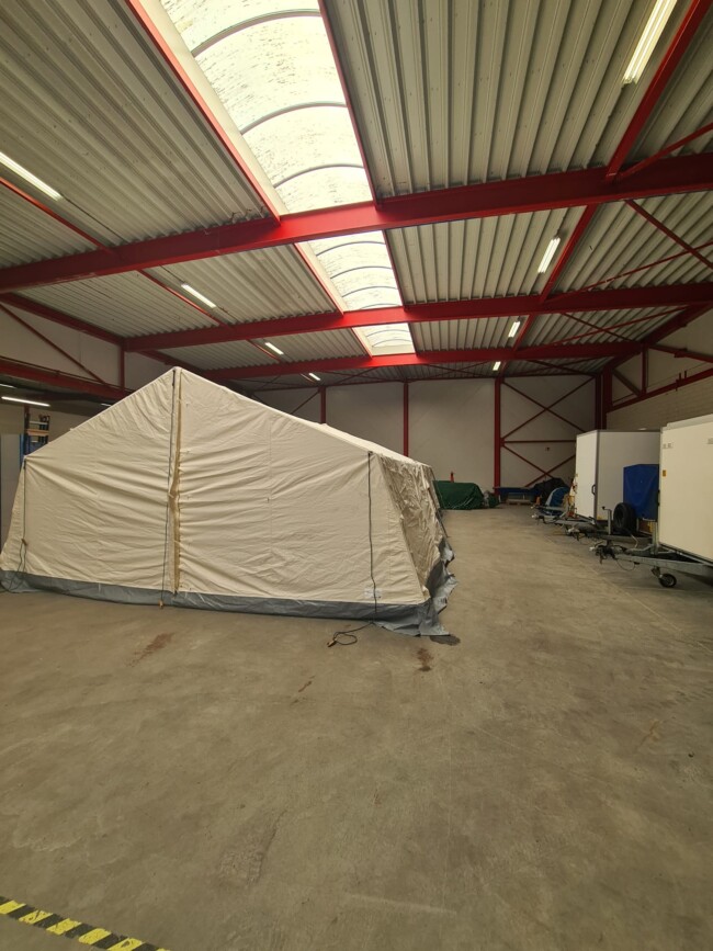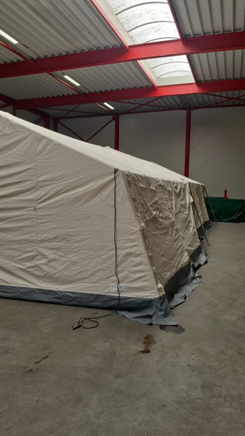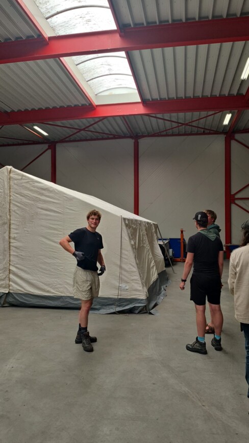 De leiderstent en joosttent zijn vakkundig opgezet in een loods in Assen om te drogen.